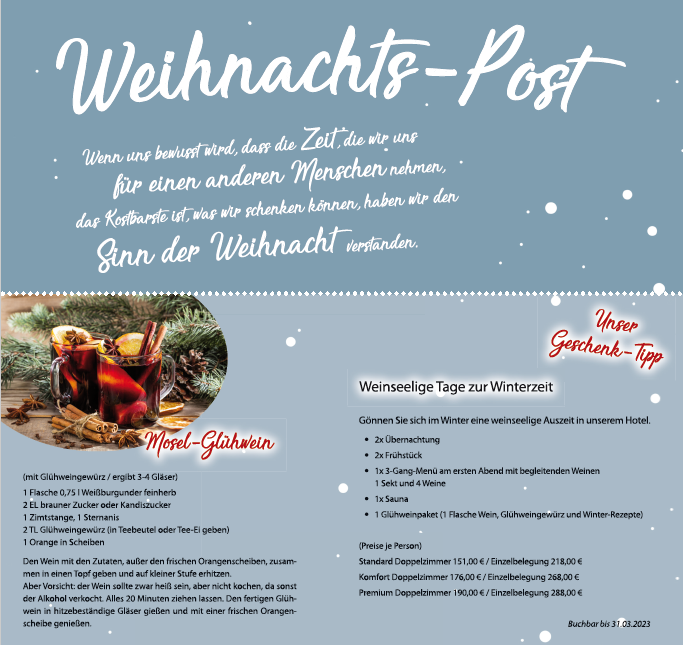 Noch eine Spur winterlicher wäre zum Beispiel auch eine Glühweinwanderung, die im Winter auf eigene Faust durchgeführt werden kann.